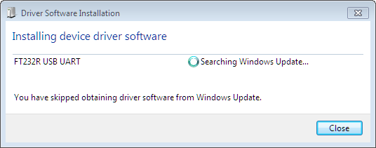 You may find that you need to install the driver twice, once for what Windows will probably call the “FT232R USB UART,” and a second time for the “USB Serial Port.” If so, follow the same procedure as above: skip Windows Update, let Windows find the driver you installed, and if it fails, run through the FTDI setup executable once more.