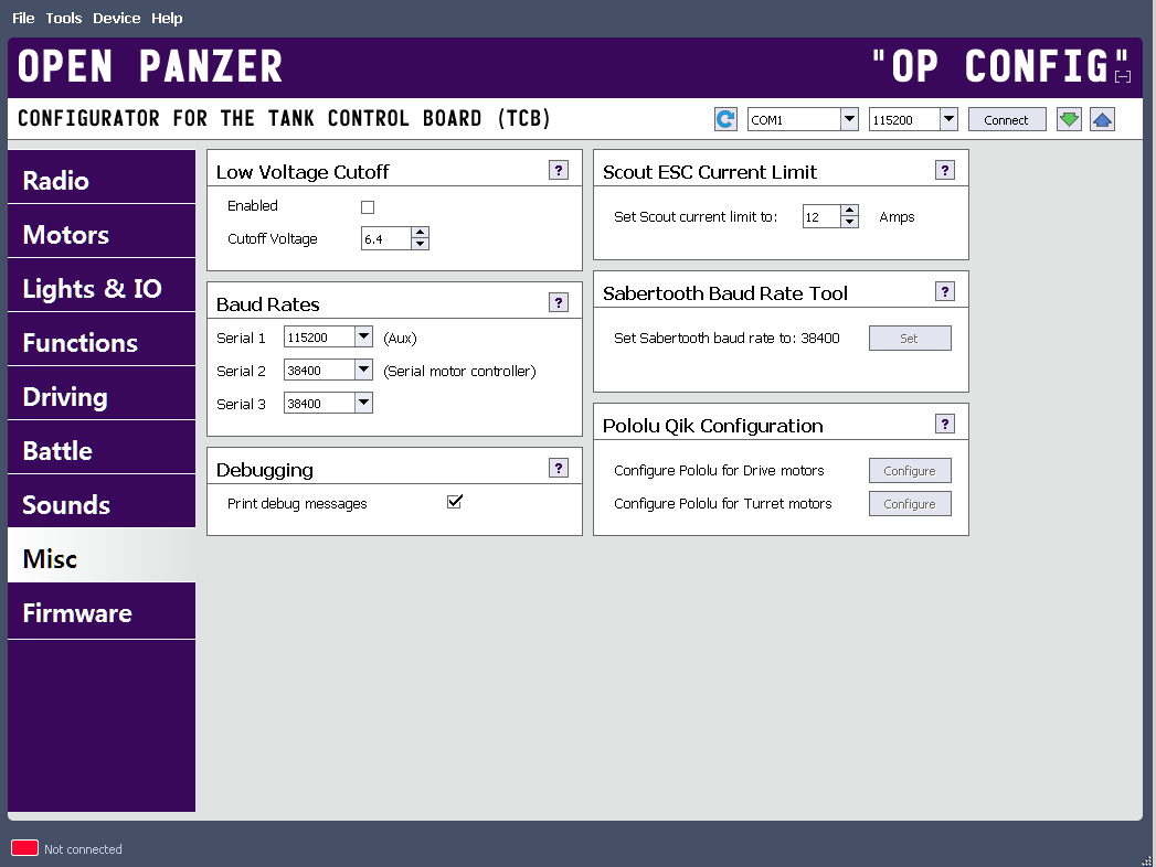 To configure a Pololu Qik controller, connect it to the TCB's Motor Serial port and provide it with power from a battery. OP Config must also be actively connected to the TCB via USB or Bluetooth, otherwise the configuration buttons will be disabled.