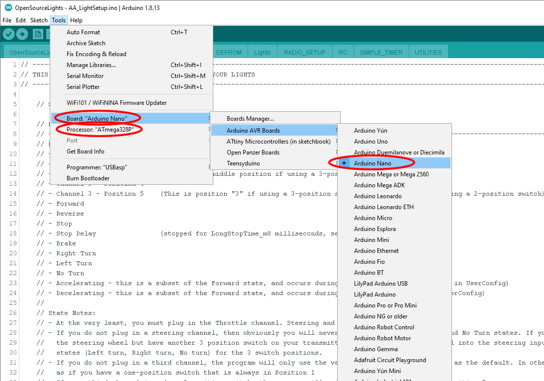 - In the IDE, go to the Tools menu and select Board → Arduino AVR Boards → “Arduino Nano.” In fact several boards would work, but “Nano” is the easiest to remember.