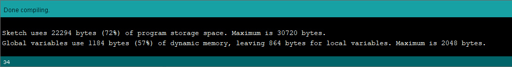 - Compile. This is done by clicking the checkmark button at the top left of the IDE window, or by going to the Sketch menu and clicking “Verify/Compile.” The IDE will run for a few moments then give you the results of the compilation at the bottom of the screen. If successful, it will look something like this:
