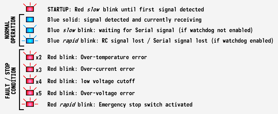 During normal operation the blue LED indicates the status of the incoming signal. If a fault is detected the motors will be immediately stopped and the red LED will flash a numeric sequence indicating the reason.