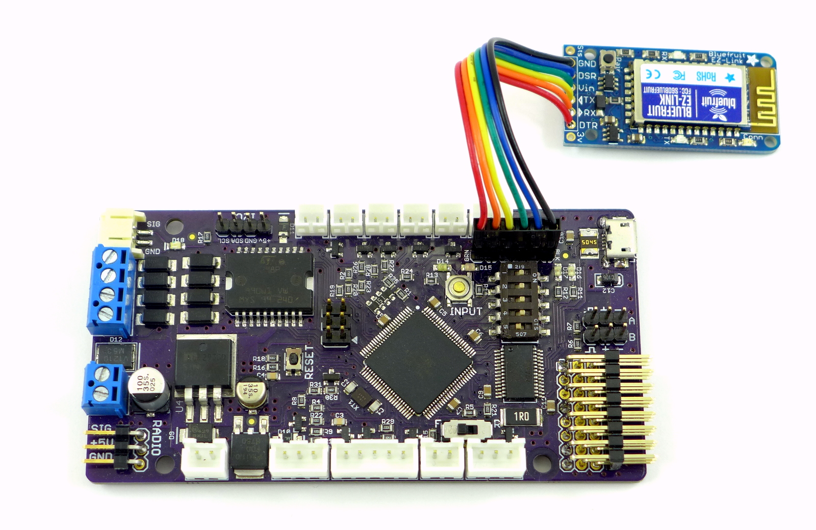 The Bluefruit EZ-Link comes without any headers. You will need to solder a 6-pin Dupont pigtail to it so it can plug into the TCB's SER.1 connector (Serial Port 1). The pin order on the Bluefruit and the TCB will match exactly, just be sure not to reverse the Bluefruit when you plug it in!
