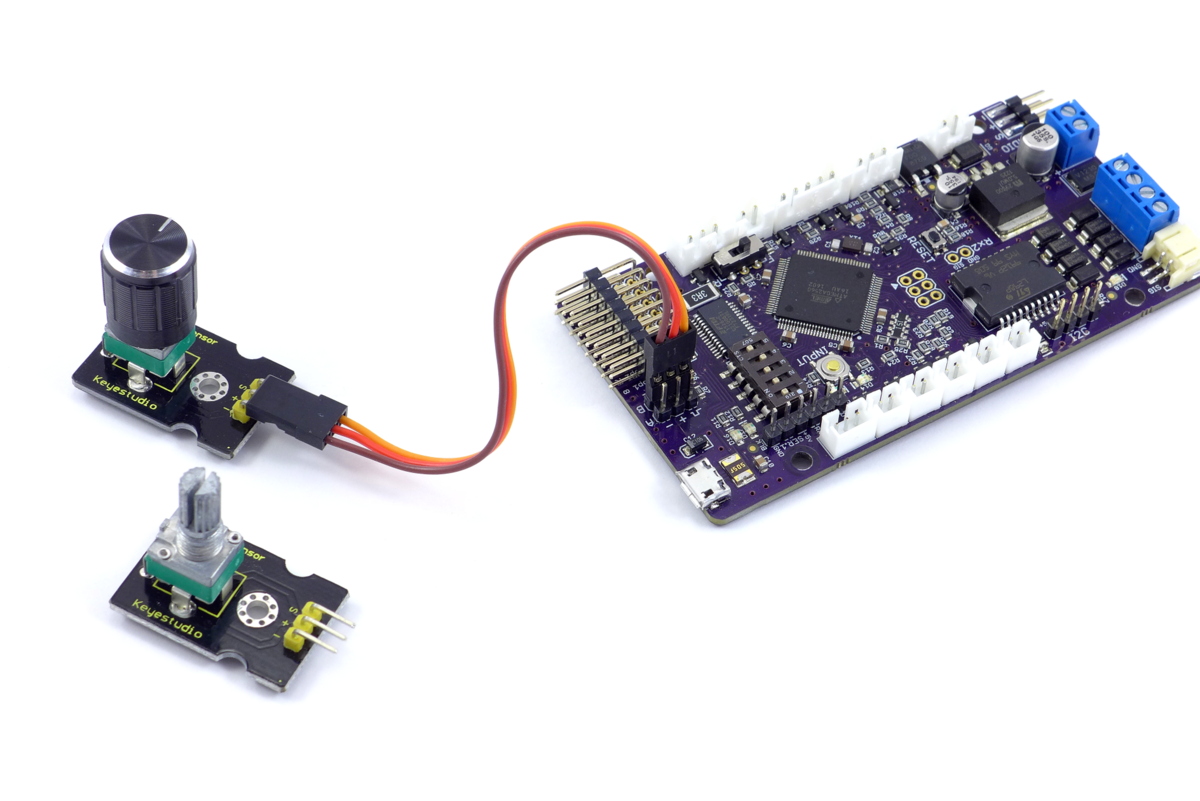 If you set an I/O port to input you can then use it as another trigger that can be applied to any function. You have the choice of two types of input: digital, which should be used with an on/off switch; or analog, which can be used with a potentiometer in the 1k - 10k range. These correspond to the two types of functions: digital (on/off functions) or analog (variable functions). If you don't want to wire your own potentiometer, Keyestudio sells what they call an Analog Rotation Sensor for cheap that can be connected to one of the TCB's inputs using a standard male-to-male servo cable, no soldering required. The Keyestudio potentiometer has a 6mm shaft, a standard size that makes it easy to find decorative knobs (just search eBay for “6mm knob”).