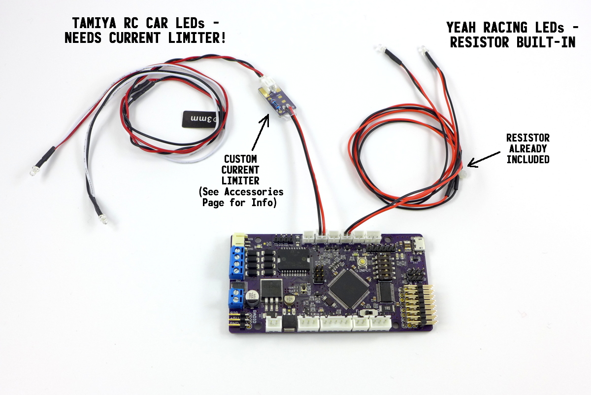 Tamiya sells a wide range of LEDs as hop-up parts for its RC cars that will plug directly into the TCB, but they do not come with current limiting resistors and will burn out if you don't add them to the wiring yourself. They also cost substantially more than the Yeah Racing brand.