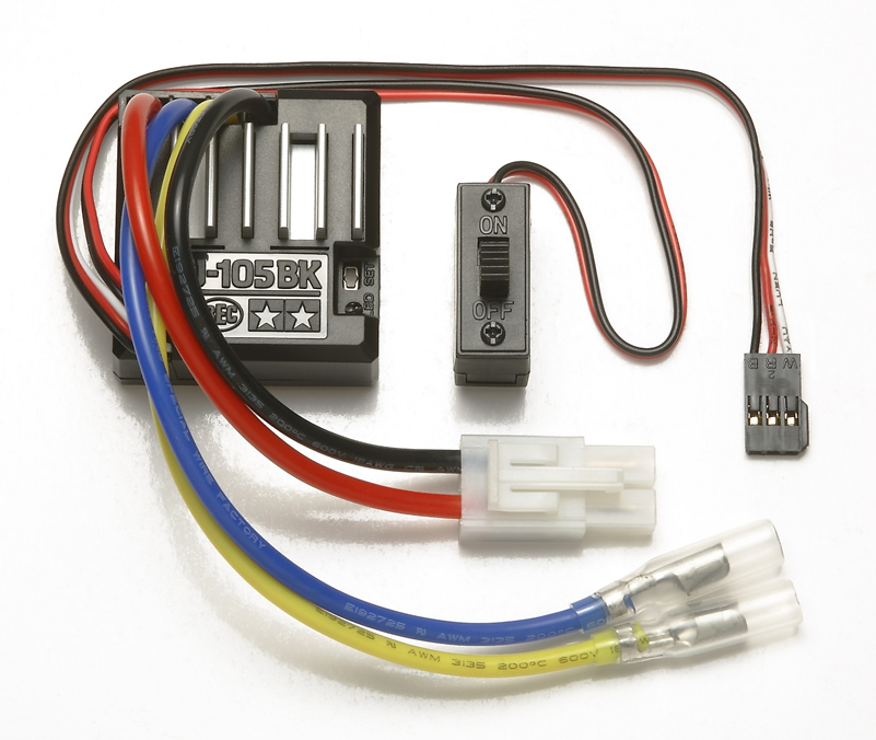 Tamiya TEU-105BK Brushed ESC Tamiya has several brushed ESCs designed to be used with their RC cars that could also work with the TCB, these include the TEU-101BK, TEU-104BK, and the TEU-105BK. All are rated to 60 amps but the 104 and 105 both limit power in the reverse direction to 50%. All three operate at 1 kHz frequency which is extremely loud and annoying. All of them, even the ones that say “no BEC” still must have the center pin of the signal cable removed before attaching to the TCB.